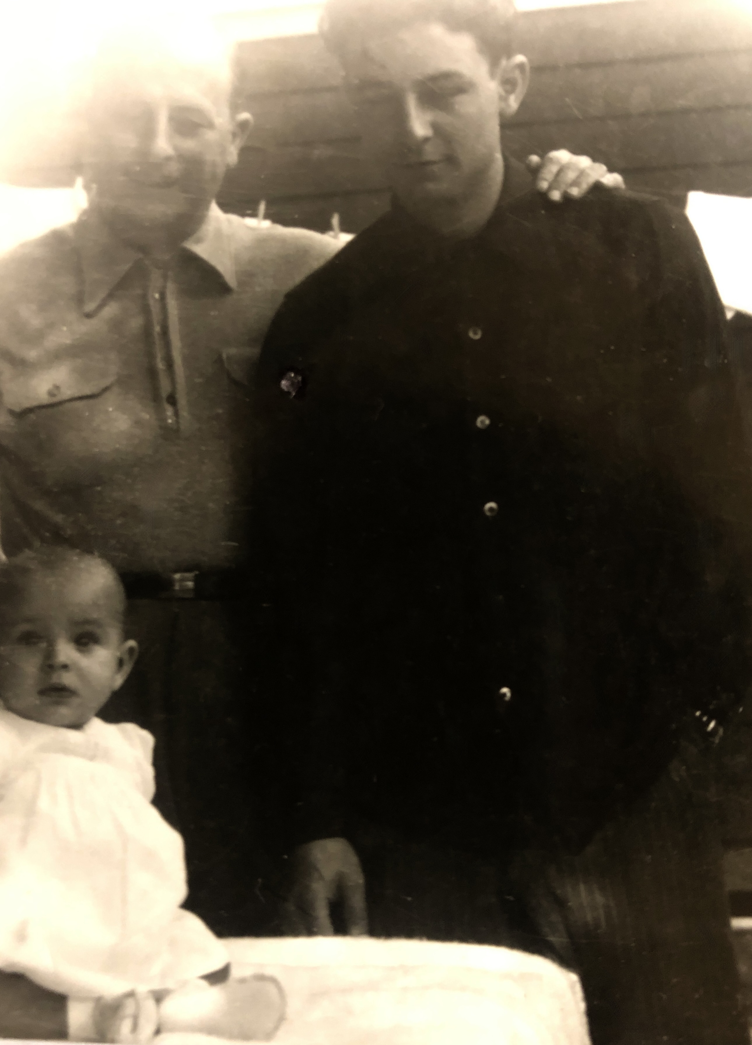 Our earliest Italian stories begin with Larry’s grandmother, Rosalina (maiden name uncertain), pictured here in the only photo we have of her. Born in Turin, Italy, and said to be the daughter of a prominent lawyer, she traveled across Canada in the 1890’s with her young son, Jimmy, in search of his father – a Vancouver brewer – who’d long since promised to send for them. When she found him already married with another family, and without other options, she married Fortunato Ferrari, an immigrant coal miner.  They settled in Seattle and had four children – the third of which was my grandfather, Charlie, who would one day become an infamous San Jose bootlegger.  His magnetic charm would capture and then break the heart of my Portuguese grandmother, Alice Thomas. After their tempestuous split, Rosalina took care of my father, Larry and his sister Dotty, until her death in 1929.  Here’s Larry some twenty years later introducing Charlie to his first grandchild – me.