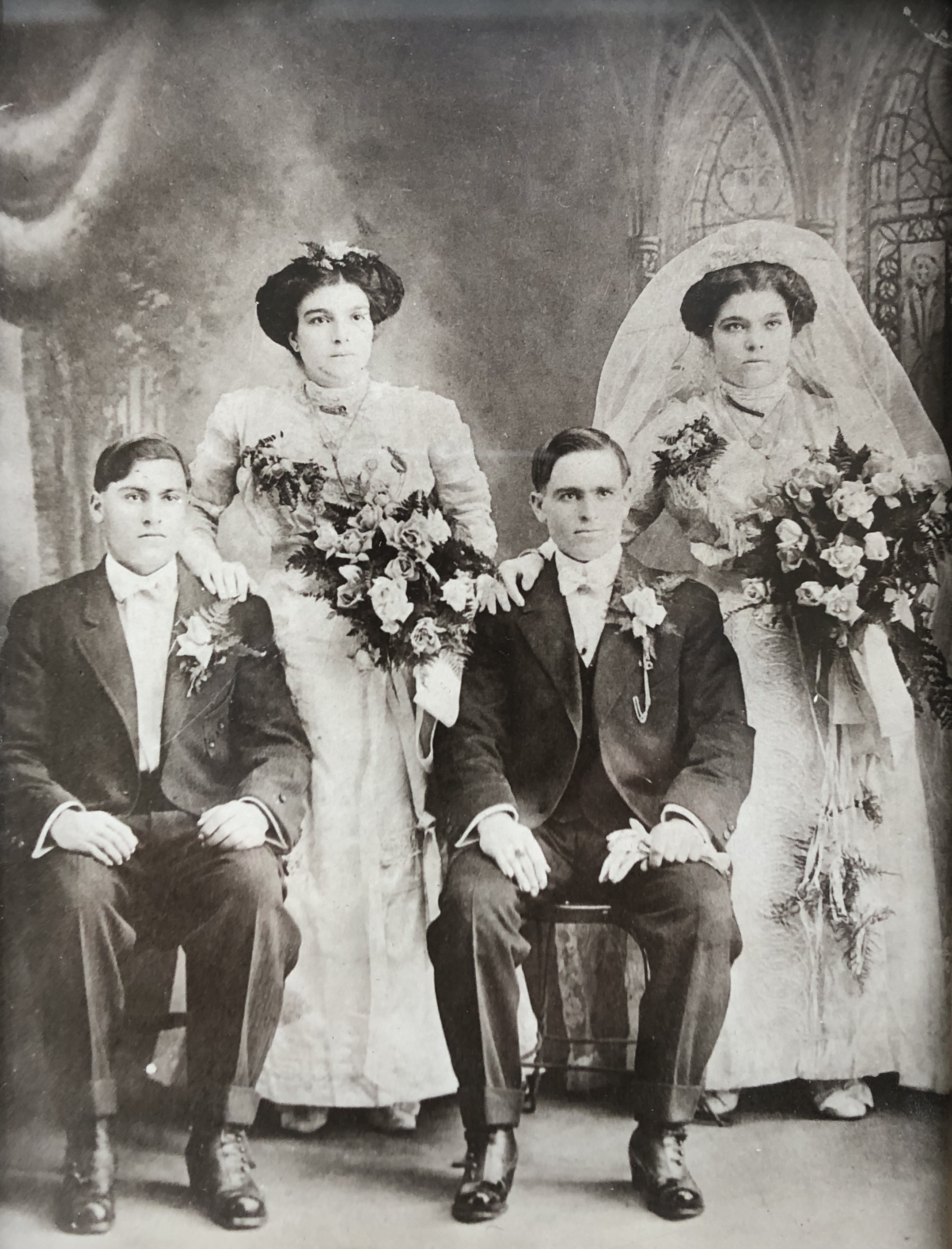 The first one shows my sister-in-law Ginny Dodge’s maternal grandmother, Vitina Amaro, on her wedding day in Sicily with her new husband Mateo Gentile. They are accompanied by Vitina’s sister, Ninata, as matron of honour, with her husband, Tony – Mateo’s brother 🤣!  All of them would soon settle in St. Louis, Missouri.
