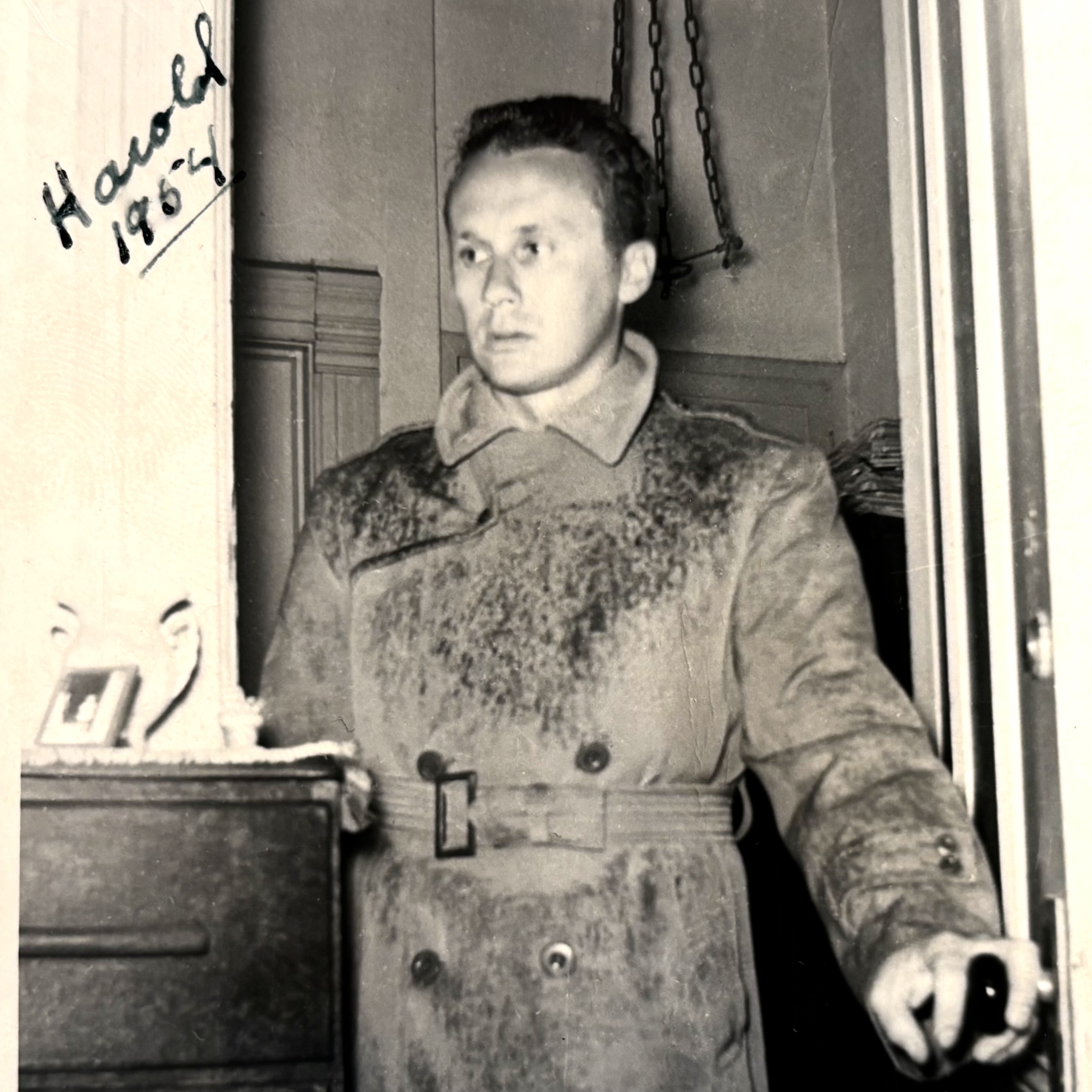 But what little we know about him comes from Mom and what can be gleaned from his fascinating photos – like this mysterious one which Mom found in Lola’s trunk after she died.  That’s grandma’s handwriting with the date – 1954 – two years after Grandma married Robert and moved to Iowa.   So Harold had to be visiting her there.  And in uploading this unusually candid shot I noticed the small photo on Grandma’s dresser.  It’s me standing in the doorway of our house in Watsonville sometime in 1948 😊.